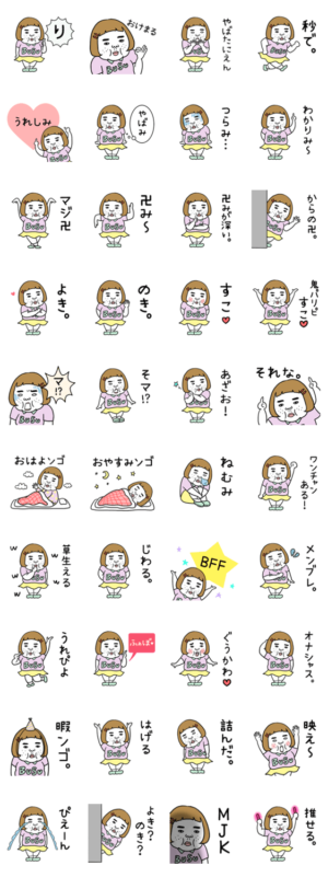 憎めないブスの女スタンプ流行語.JK語の流行り言葉ver.です。ブサイクだけど愛嬌がある自虐ネタスタンプです。すこ,鬼パリピ,マジ卍,おはようンゴ,うれぴよ,メンブレ等。キャロライン企画 より発売