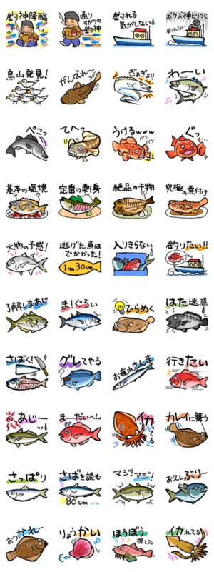海釣り・船・魚好きな人のためのスタンプです。気楽に付き合える友達や仲の良い家族におすすめ!親父ギャグを多く用意しました。笑いのある会話をお楽しみください。