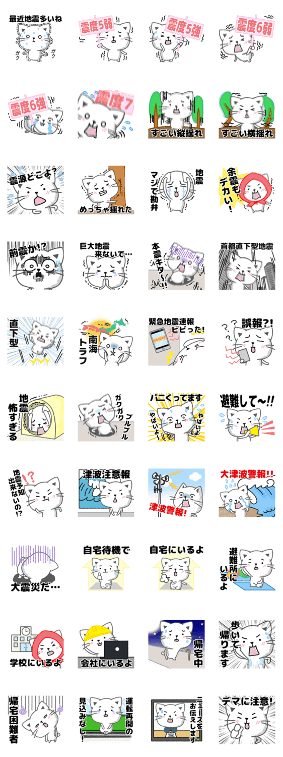 首都直下、南海トラフ等の大地震が迫る地震大国日本。緊急地震速報、余震が続くとき等、使いたくないけど地震や津波等の災害のときに使えるかるかもしれないスタンプ。YUKIHIMASNOW より発売