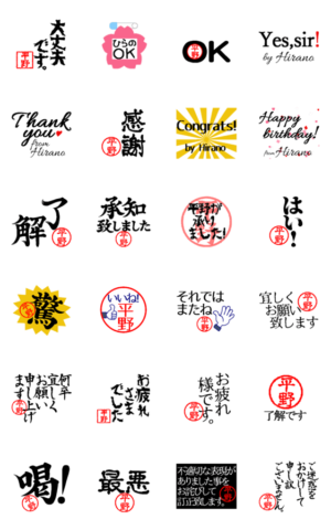 時には真面目に時には力強く、時にはオシャレに時にはかわいく。はんこメインのデカ文字平野(ひらの)さんスタンプです。