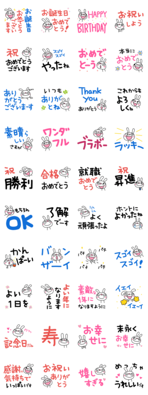 ふんわかウサギ第9弾。お祝い編。「お誕生日おめでとう」から「お幸せに」まで。合格、入学、誕生日。素敵な記念日にお祝いの言葉を送ろう。