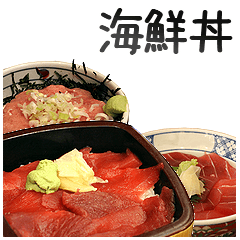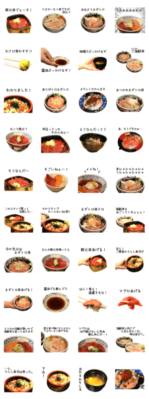 海鮮丼のスタンプです。鉄火丼、マグロ丼、ネギトロ丼、サーモン丼、ちらし寿司など。魚、お寿司、お刺身、和食最高!実写食べ物写真スタンプシリーズ。飯テロにも。竹野チコ より発売