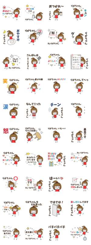「りかちゃん」専用。日常会話で毎日使いやすい名前スタンプの基本セットです。里佳/理加/理香/梨香/梨花/梨加子/利香/理佳/莉香/りかこ/まりか/リカ/大人/無難/メッセージアルクルム より発売