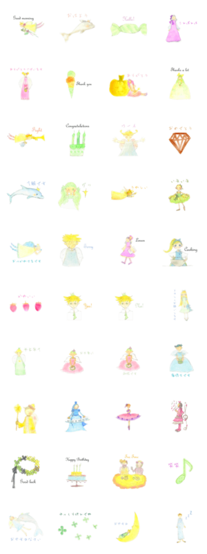 天使とイルカと音楽などを水彩とパステルで描いたイラストスタンプです。日常よく使う言葉を淡いイラストと丁寧な言葉で作りました。かわいい天使たちを届けてください。yukiwo より発売