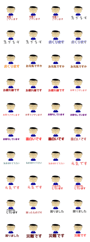 よく見るとつぶらな瞳の中高年男性。押したくなるスタンプです☆