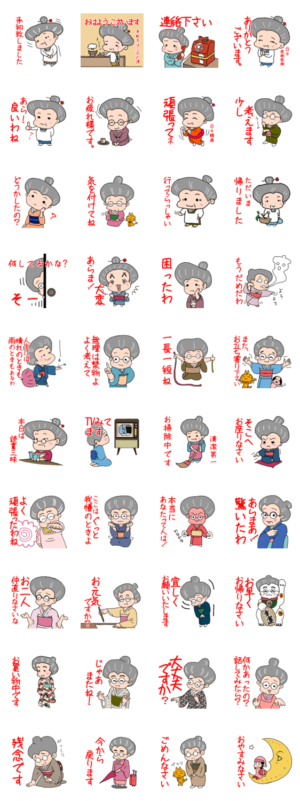 高齢者のための日常スタンプです。たまねぎ頭の上品なご婦人です。TENTEN より発売