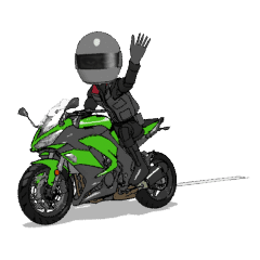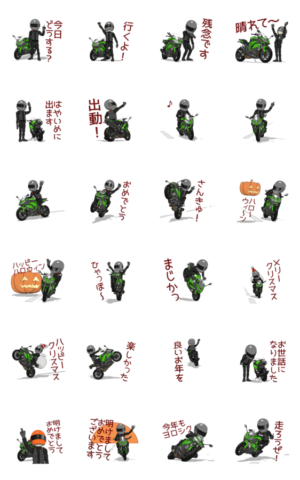 バイクが大好き。バイクに乗ってるだけで楽しいライダーです。オートバイの動くスタンプです。ハロウィン、クリスマス、お正月。ライムグリーンのバイクです。bon より発売