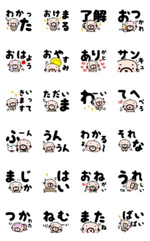 とっても見やすいでか文字スタンプです。ちいさなおやじがかわいく動きます。いえーい!前田ムサシ より発売