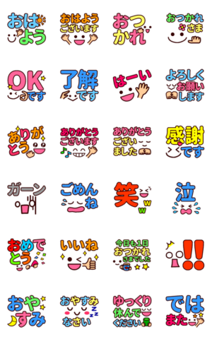日常会話でよく使う言葉を厳選した超お得基本セット!大人の挨拶&敬語!気持ちを贈りキモチ伝える大きめでか文字!かわいく動く!親しみやすい表情の無難な顔文字シリーズ