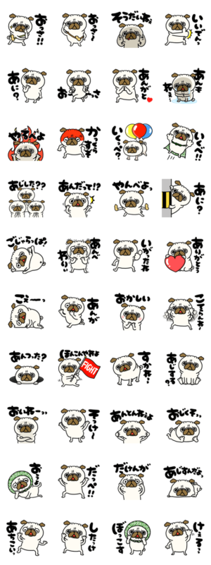 千葉県の方言(房総弁)を話すパグさんの日常で毎日使えるスタンプです。千葉の方、パグちゃん好きの方、犬好きの方にもおすすめです♪ぴよたぬき より発売