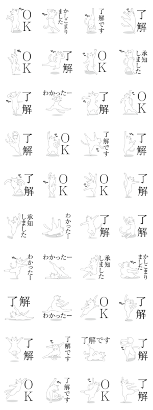 輝いてイエス。美しく了解。よく使う承認をダンスや体操の躍動感で華麗に表現。使いやすいネコデザインで構築。了解のハンワ より発売