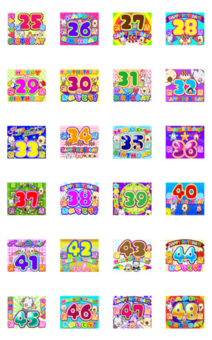 25歳〜48歳までの誕生日を迎えた方へ送るスタンプです。 各年齢ごとに違うデザインでかわいいわんことぶたさんが添えてあります。 でか文字ネオンが光って盛大に祝えます。