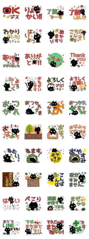 毎日よく使う基本の言葉(あいさつ、あいづち)を厳選。カラフルなでか文字に黒ねこでやさしい。秋色・冬色で大人かわいい。敬語も入って無難に使い易い。【デコスケ作】