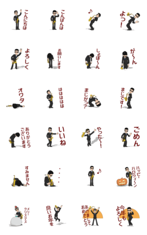音楽が好きだ!動くスタンプです。吹奏楽。サックスを愛する。ハロウィン、クリスマス、お正月。いつも演奏する。bon より発売