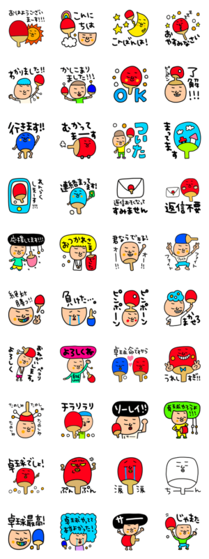 卓球スタンプ。よく使う言葉でセットにしましたー!かわいいものからシュールなものまで。riekim より発売