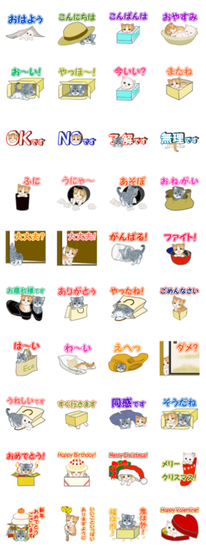 箱や袋や隙間が大好きな子猫たちが、いろんな所からひょっこり。大きめ文字で、よく使う言葉が入っています。誕生日・クリスマス・お正月・節分・バレンタインにもどうぞ。つのっち より発売