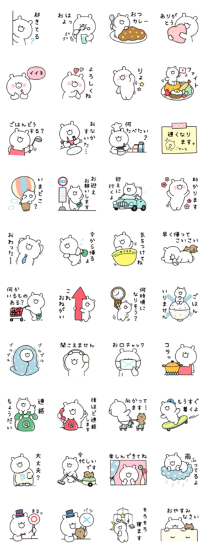 やさしい文字と癒し系なクマが好きで使ってます。帰り時間を聞くことが多いので、「何時頃になりそう?」のスタンプが大活躍です。