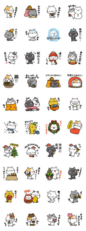クリスマスから年末年始、節分、バレンタインなど、寒い冬を楽しむ猫たちのスタンプです。