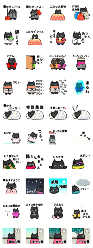 雪に悩まされている寒がりねこが、雪かきしたり着込んだり冬眠したりするスタンプです。 寒がりの方・雪深い地域にお住まいの方におすすめです。てるぜろ より発売