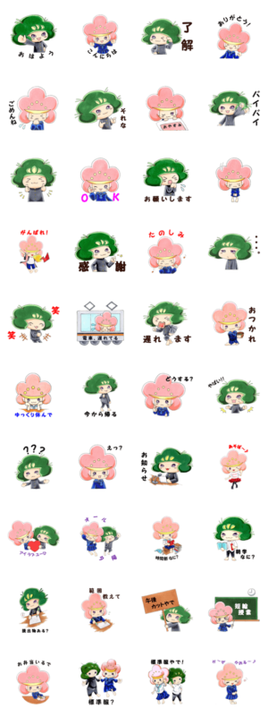 卒業生がデザインした『向上心』『勇敢』を意味する松と『高潔』『忍耐』を意味する梅から生まれた双子の妖精さん。平成30年度PTA発案、生徒達の協力を得てスタンプ誕生!