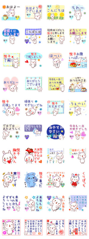 悦子さん専用の正月と毎日の挨拶用でか文字名前スタンプ。一日と一年の始まりと終わりの言葉と毎日よく使う言葉集。悦子、えつこさん等に。クリスマス等冬のイベント用もけーT より発売