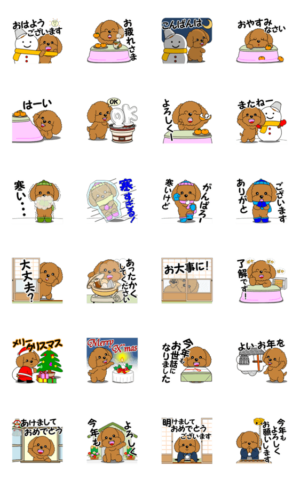 トイプードルの冬の挨拶スタンプです。年末や正月の挨拶も入ってます。ヒサケイプリン より発売
