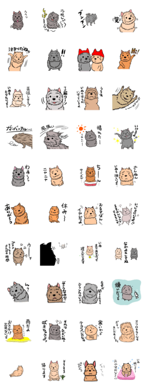 ワンコのきもち、犬の思いを代弁した毎日使える?内容。ケアーンテリア(ケアンテリア)のおもしろく、ゆる〜い スタンプです。Tea*Bee より発売