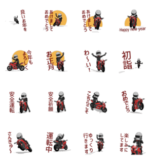 ライダー達が楽しく集まる。賑やかな時間を過ごせるように願います。スーパースポーツが好き。SSライダーが使うスタンプです。お正月。赤いバイク。