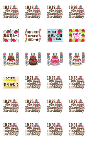 祝いたい生まれ月を入れて【まつこの◯月お祝い】で検索。10月17日〜31日お誕生日を祝うスタンプ/ハッピーバースデー/happy birthday cake/ケーキ/に贈る/送る/動くMatsuko2016.11 より発売