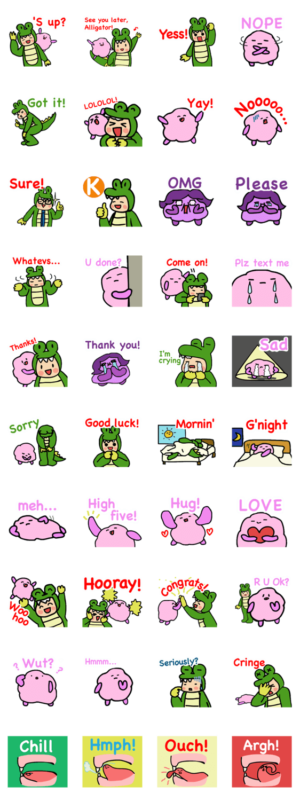 『あいうえおフォニックス』アリー&ファジーの英語のスタンプ。ネイティブが使う日常表現(スラング)です!かわいくて癒される、楽しいスタンプで英語も覚えちゃお!