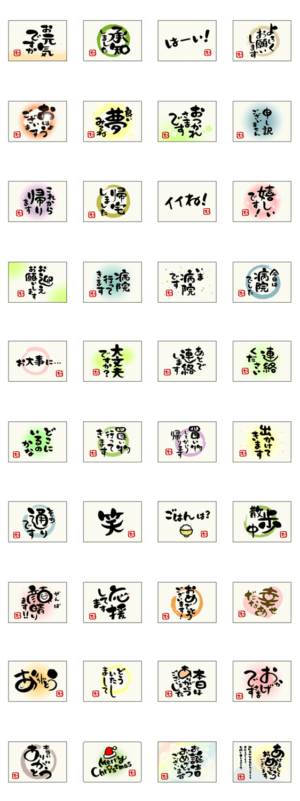 中高年、シニアも使えるように大き目の文字にしました。挨拶、お礼、病院など日常の出来事を筆文字アートで表現。ポストカード感覚で使えます♪