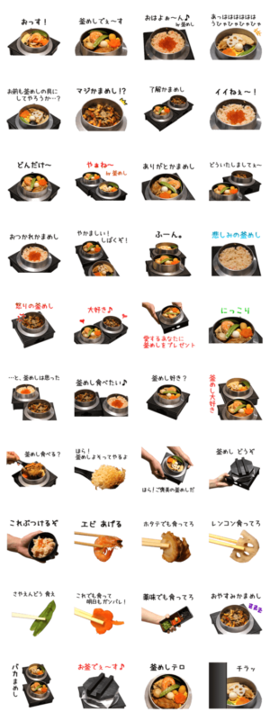 釜飯(かまめし)の写真で作った実写スタンプです。お釜で炊いたほかほかのご飯をどうぞ。飯テロオにも。カマメシ。実写食べ物スタンプシリーズ。竹野チコ より発売