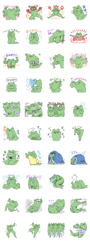 二足歩行カエル、たかしくんのLINEスタンプ第5弾です。 使えそうなのと使い方がわからないもの半々の気持ちで作りました。