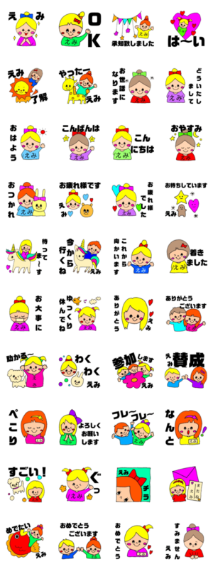 名前えみさん専用スタンプ。かわいい女の子ユニコーン。了解、賛成、参加します、よろしくお願いします、お大事に、どういたしまして、敬語入りで会話に使える。大人女子に