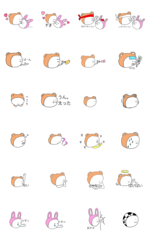 くまのきぐるみを着たくま太郎とうさぎのきぐるみを着たうさ子のスタンプです。totto-to より発売