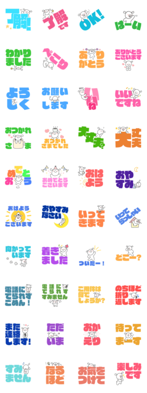 大きくて見やすい!カラフルでかわいいでか文字スタンプ!挨拶など使いやすい言葉を集めました。(絵文字は「はらぺこぺろりー」をどうぞ)