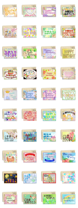 大人可愛い【グリーティングカード風】の「お誕生日おめでとう」「HAPPY BIRTHDAY」多めの「年間行事」で送るかな?っていうスタンプにしました。高齢者(シニア)にもお勧め