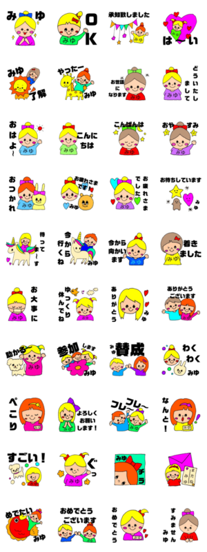 名前みゆさん専用スタンプ。かわいい女の子ユニコーン。了解、賛成、参加します、よろしくお願いします、お大事に、どういたしまして、敬語入りで会話に使える。大人女子に