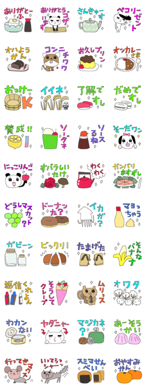 すばらしくカワイイ、みんなで使えるカラフルでハッピーな40個。シンプルなイラストと大きな文字が便利なダジャレスタンプ。大人カワイイでか文字です。