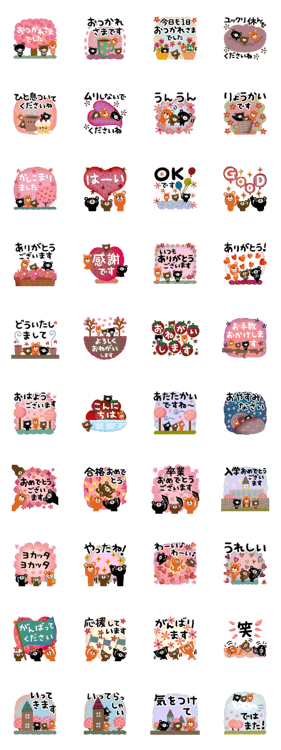 ブラクマシリーズの春スタンプです。 おめでとうがイッパイの春♪合格、卒業、入学などのお祝い用も入っています。 敬語多めなので上司や先輩、大切な人に贈ってね。