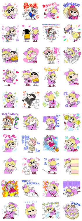 きゃりーぱみゅぱみゅとクレヨンしんちゃんの夢のコラボスタンプ♪ 臼井儀人&UYスタジオ描き下ろし。衣装や振り付けポーズなど、毎日使いたくなるスタンプが勢ぞろい!