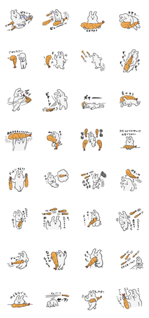 エビフライとうさぎのスタンプです。どうぞ困惑しながら使ってください。ふるえるとり より発売