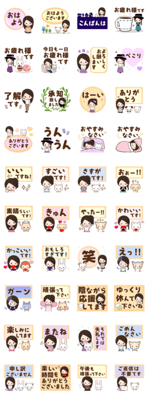 好評の褒め言葉シリーズ!今回は大人かわいい雰囲気の女子と動物スタンプです。デカ文字なので見やすく、仕事仲間や上司、友人と幅広く使えます。絵文字も販売中です!
