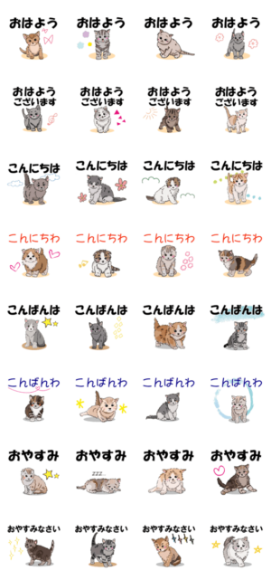 朝昼晩で使うあいさつだけを集めたカワイイ猫のイラストスタンプです。男女・子ども・大人・シニアまで使えます。おはよう・こんにちは・こんばんは・おやすみ