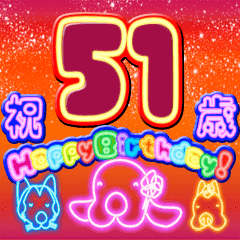49歳〜72歳までの誕生日を迎えた方へ送るスタンプです。 各年齢ごとに違うデザインでかわいいわんことぶたさんが添えてあります。 でか文字ネオンが光って盛大に祝えます。