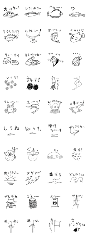 海の仲間や、それにちなんだものをもじってスタンプにしました。 中には“?”というものも。クスッと笑ってください。三日月 より発売