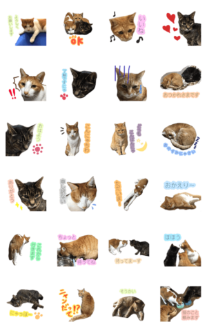 我が家の猫\'s・キジトラのドラ、茶白のラン、茶トラのリンの日常会話で使えるリアル写真スタンプです。