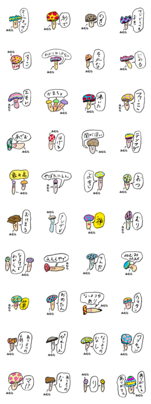 みむら専用JK語スタンプ。カラフルきのこがゆるーく話すよ。イッレ・コスヤ より発売