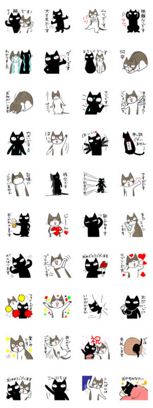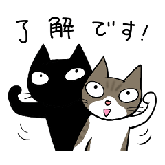 猫漫画ナノトクラスのスタンプ。黒猫「ナノ」とキジシロ「きなこ」 ゆるめの敬語です!ぱるぱ-る より発売
