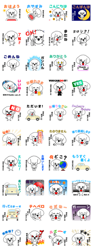 坂本さん専用の日常会話でよく使う名前スタンプ。おはよう,こんにちは,おやすみ,テヘペロ,行ってきます,ただいま等。プードルのキャラクターで言い回しが特徴です。